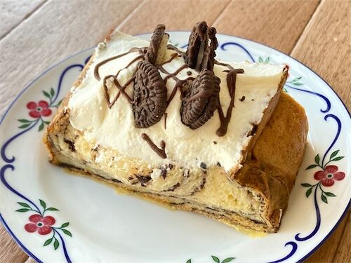 久しぶりにサリュ・アンシャンテへ。クリームをめいっぱい食べたくて、オレオクリームフレンチ。見るからに盛り上がったクリームの小山にテンション上がる。 断面のボリュームも圧倒的! パンは厚みたっぷりのチョコマーブルでフレンチトーストになってる。…