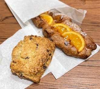 今日の区間の中では最大規模である小松駅で1時間ちょっとの昼休憩。前から行ってみたかった、駅直結のBikkeというパン屋さんへ。ベーグルにスコーンにサンドイッチにタルティーヌ、おいしそうなのがいっぱい。200円前後のものが多くてこのご時世にしては低めのありがたい価格。5個買って1000円ちょっとだった。隣のイートスペースで食べる。